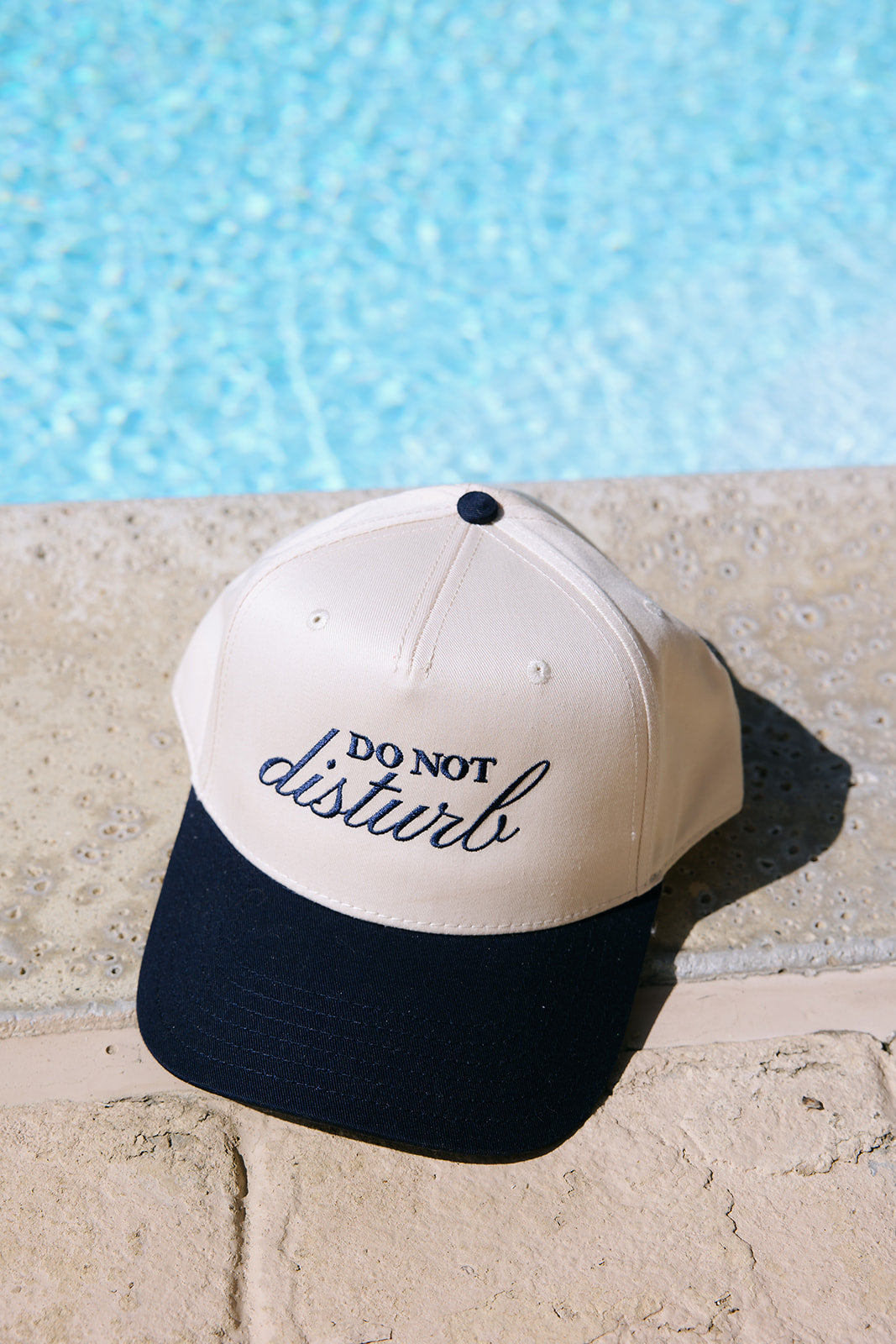 Introducing our "Do Not Disturb" 5-panel natural/navy 5 panel cap, boldly embroidered in navy thread