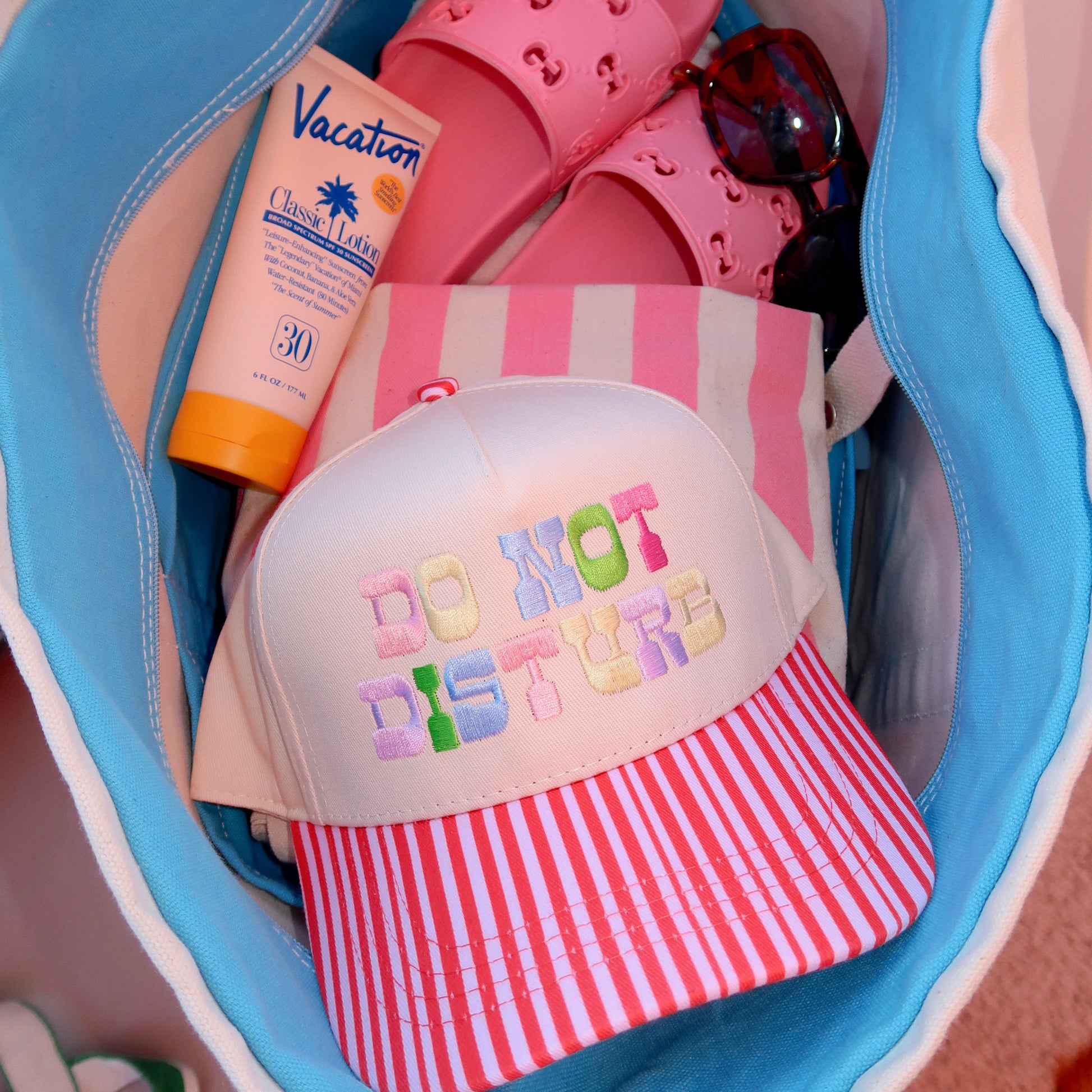 Introducing our "Do Not Disturb" hat in trendy pink stripes. Made with multicolored thread and a sewn-in ruby moon tag. Keep the sun out of your eyes and let everyone know you mean business (or just want some peace and quiet).
