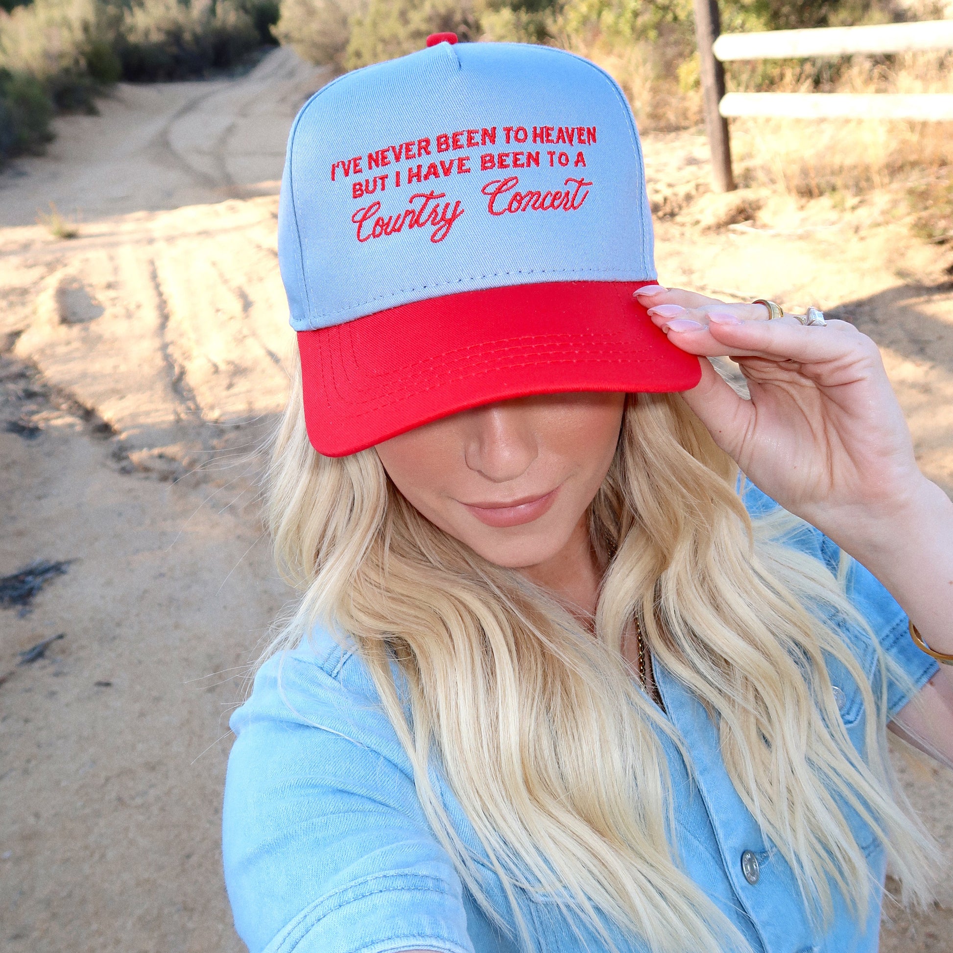 Experience the best of both worlds with our exclusive "I've Never Been To Heaven But I Have Been To A Country Concert" hat. The embroidered phrase in red thread adds a touch of country charm to the Western Sky and Red Brim color combination. Comes with a sewn-in Ruby Moon tag.