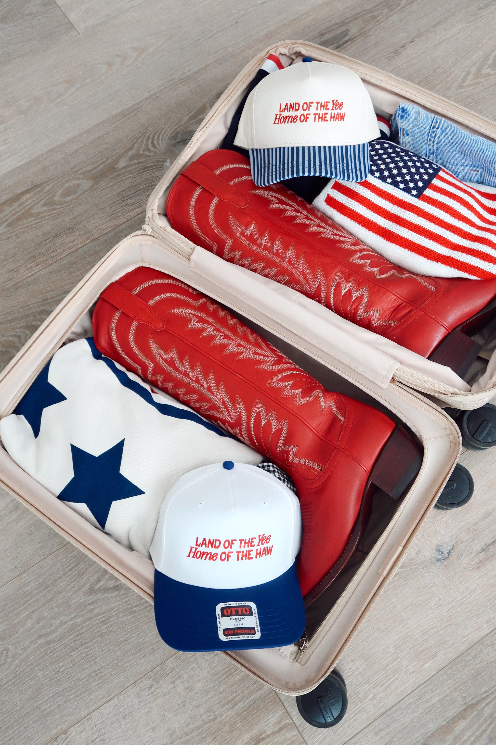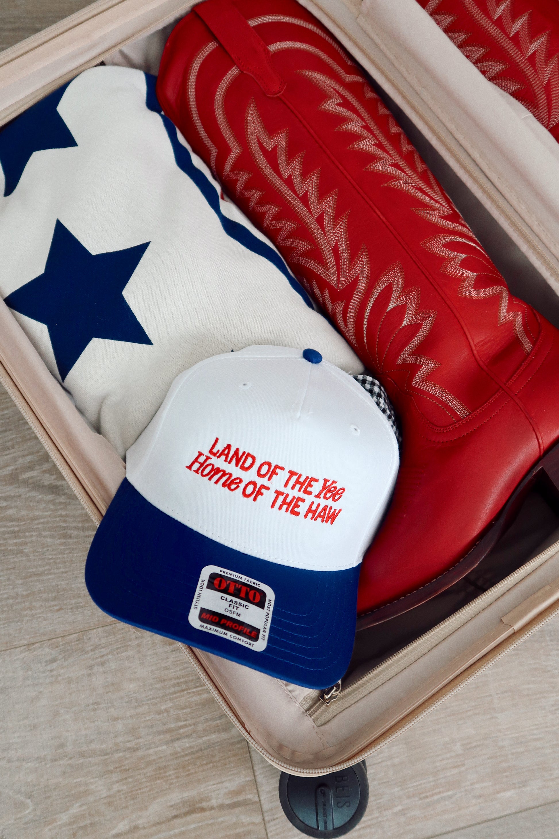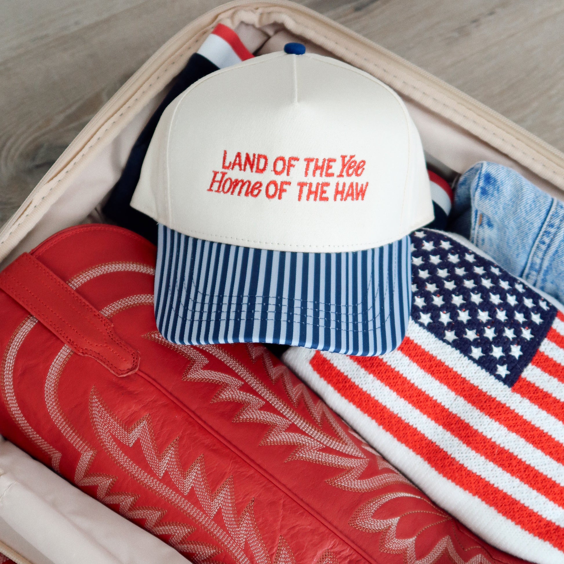Discover your inner cowboy with our Land Of The Yee Home Of The Haw hat. Embroidered in red thread, this playful accessory takes any outfit to the Wild West. Show your love for the great outdoors with this unique and stylish addition to your collection.