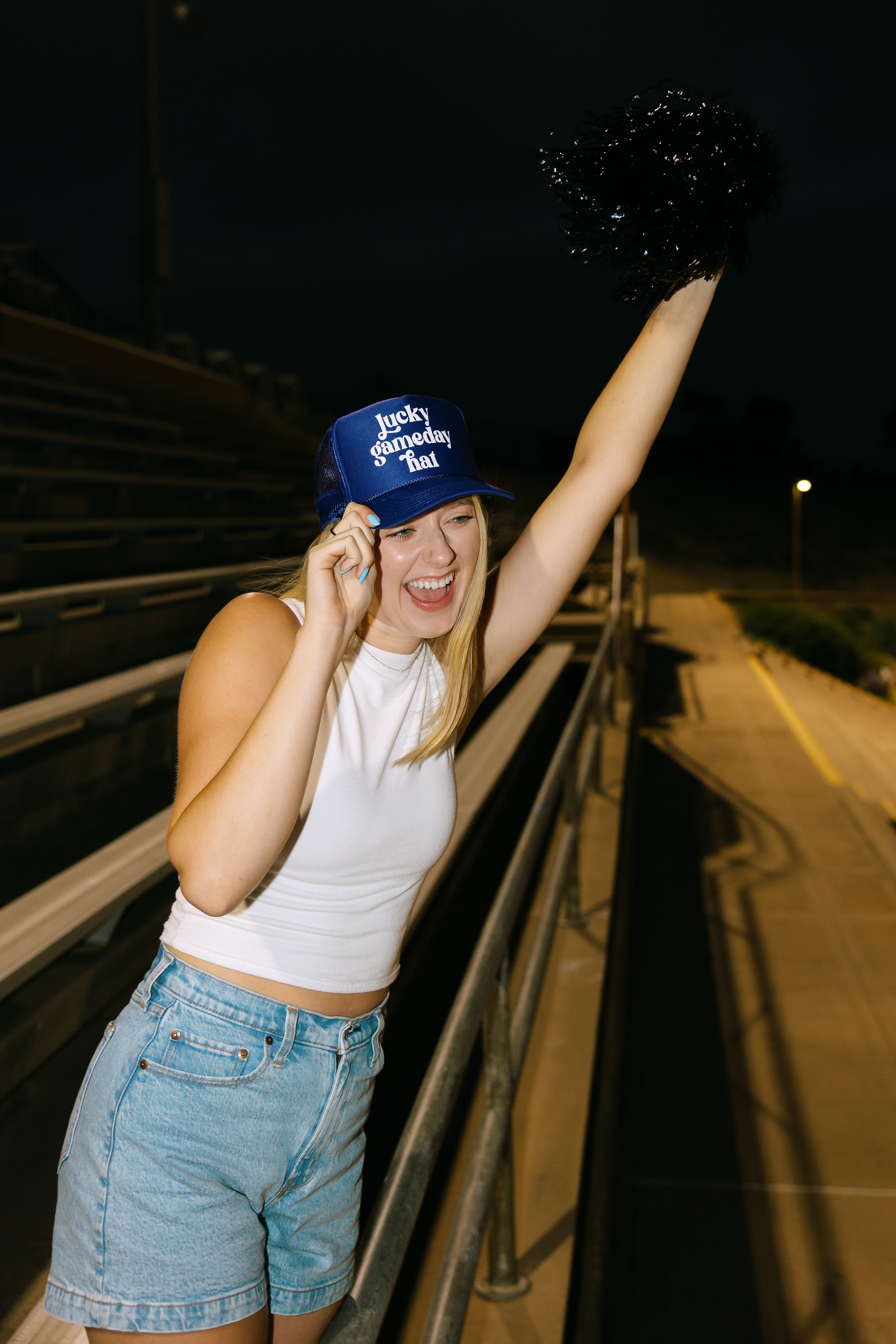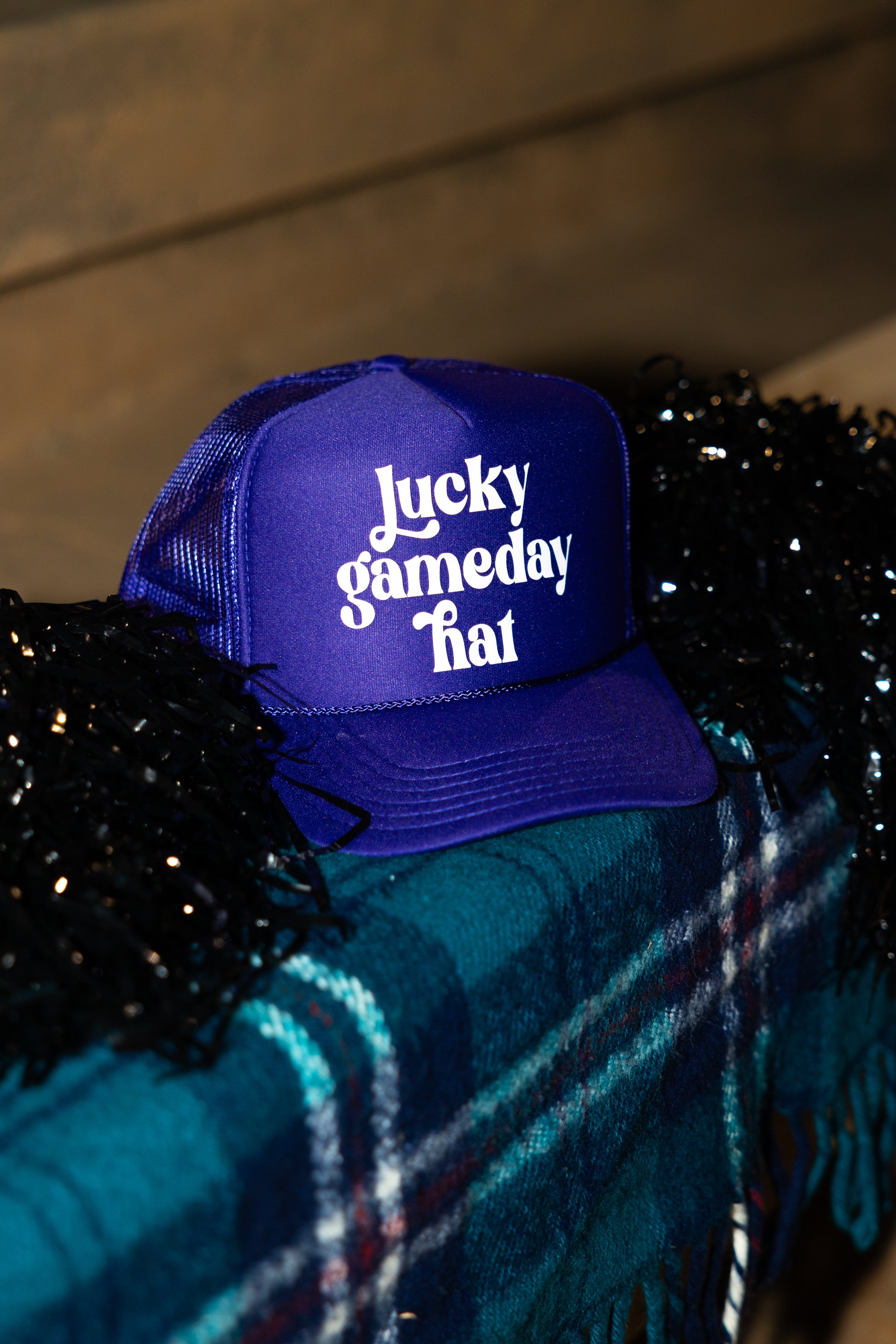 This classic foam trucker hat features bold white text that proudly declares "Lucky Gameday Hat" If you order the white foam hat, please note that the text color will be black. The hat combines comfort and style with its breathable foam front and adjustable mesh back.