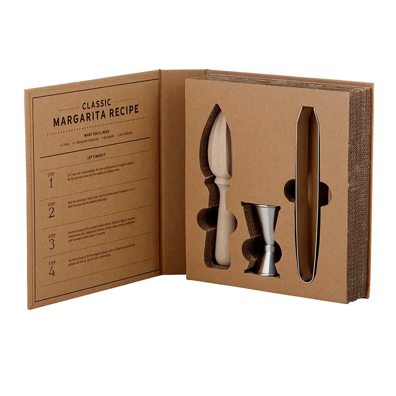 Size: Box - 7" W x 8" H x 1.75" D / Jigger - 2.5" L / Ice Tongs - 6.5" L / Juicer - 6.25" L