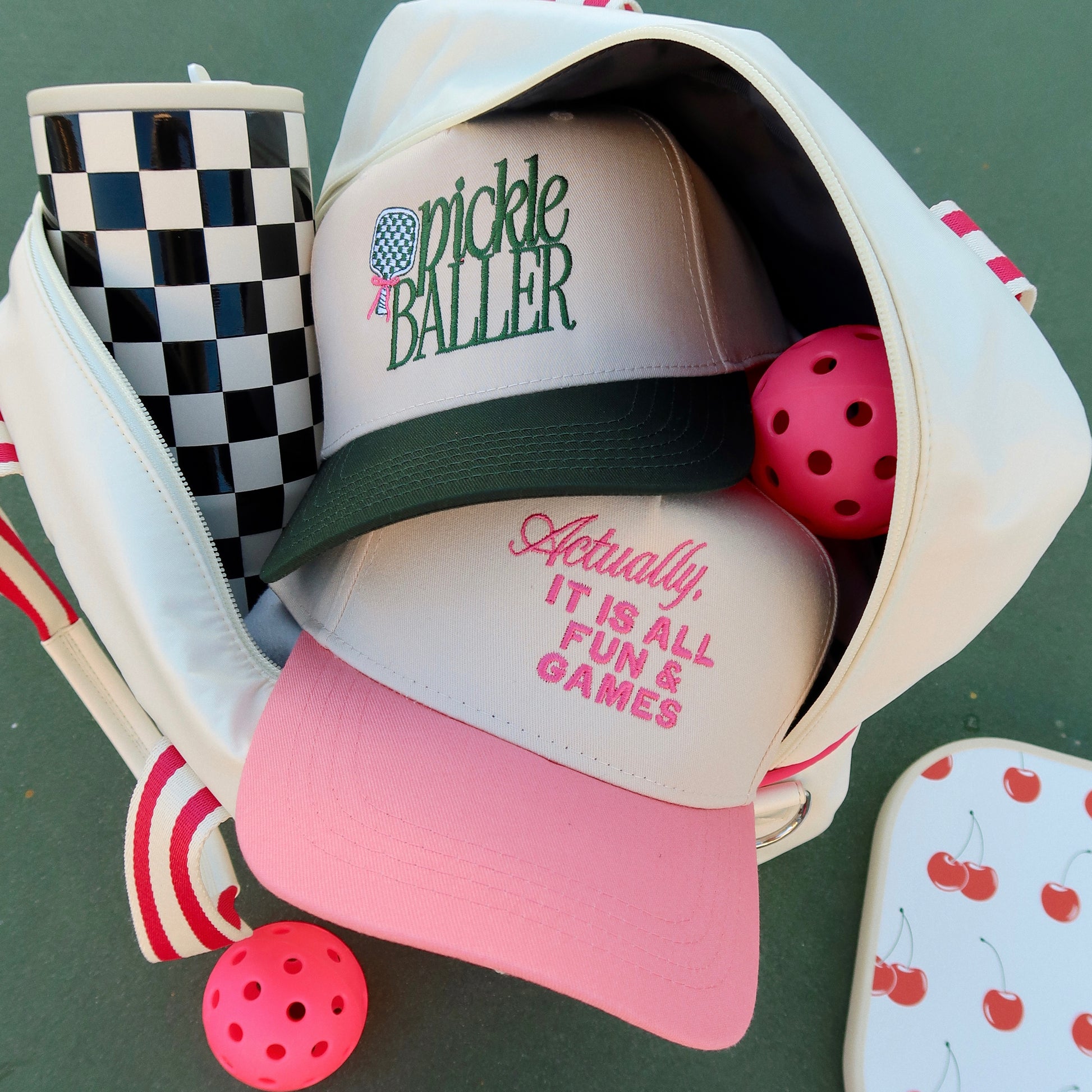 The "Actually, It Is All Fun & Games" Embroidered Hat features bright pink embroidery on our custom Ruby Moon Pink/Natural Hats.