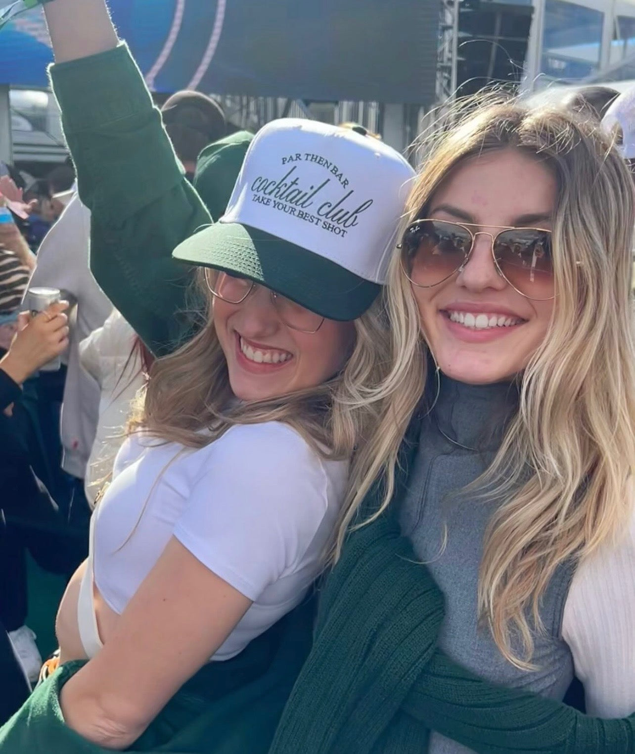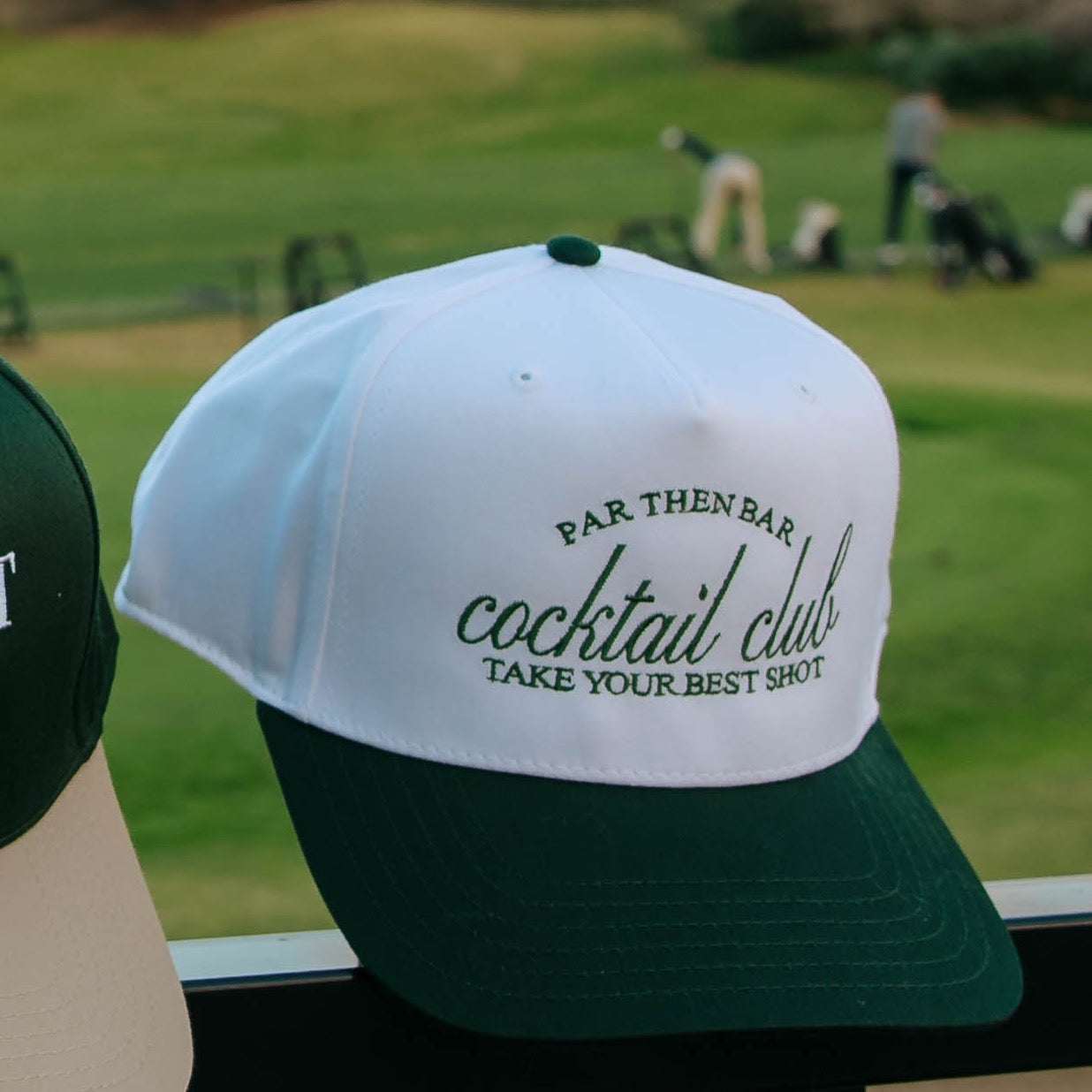 Embroidered on a dark green/white 5 panel hat in dark green thread