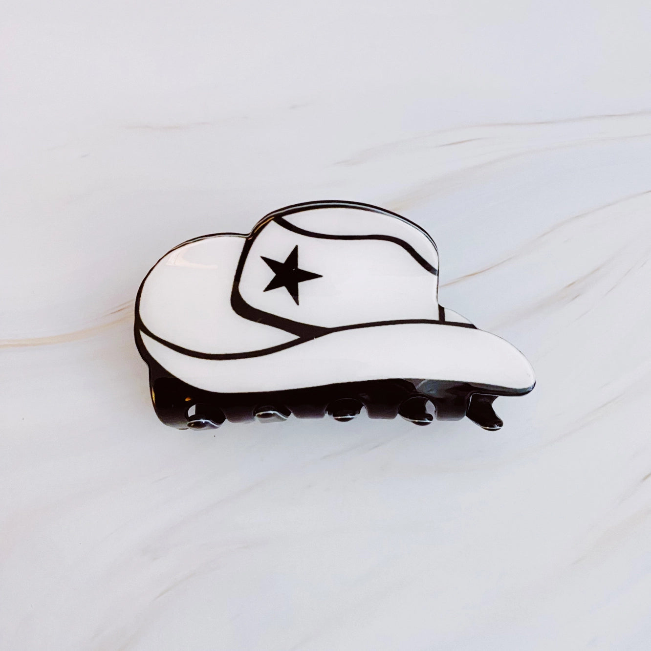 Add a touch of western flair to your looks with Yeehaw Cowgirl Star Hair Claw. This fun and trendy hair claw, shaped like a cowgirl hat, holds medium capacity for a secure grip on your hair. Dimensions: approximately 3.5" x 1.5" x 1.5"